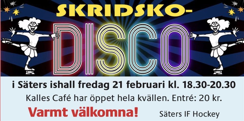 Föreningen arrangerar SkridskoDISCO fredagen den 21 februari. Det perfekta sättet att inleda sportlovet helt enkelt! Vi tänker att alla från barn till ungdomar kan få en kul kväll. Alla åldrar är som sagt välkomna där de minsta tar med sig föräldrarna. Caféet är öppet & här finns lättare mat för den hungrige och fika till föräldrar som vi hoppas hänger med även om barnen/ungdomarna är äldre. På isen finns kiosk med godisförsäljning. Vi vill erbjuda en rolig aktivitet för föreningens barn & ungdomar samtidigt som vi hoppas dra in lite pengar till verksamheten. Så ju fler desstå bättre -vi ber därför er föräldrar att hjälpa till och sprida information samt såklart peppa era barn/ungdomar att ta med kompisar. Entré sker från huvudingången ? Kostar 20 kr Säters IF Hockey 16 feb 2020 0kommentarer